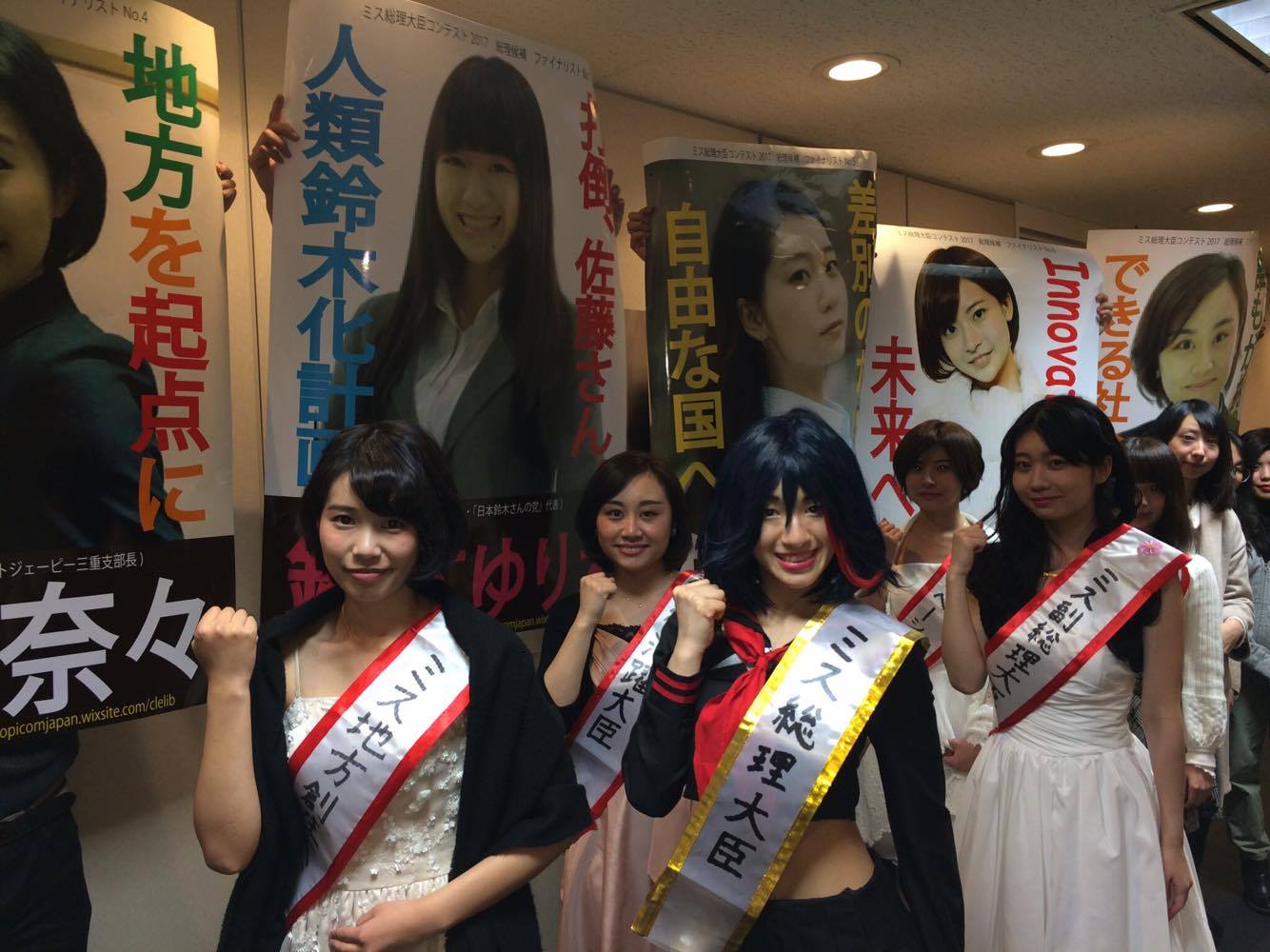 なお、ミス副総理大臣には英シェフィールド大学の佐々木桃美さんが選ばれたほか、審査員特別賞を獲得した青山学院大学の草田彩香さんがミス1億総活躍担当大臣、三重大学の藤野奈々さんがミス地方創生担当大臣、中央大学の鈴木康代さんがミスイノベーション担当大臣に選ばれ、それぞれが会場で今後の活躍を誓い「組閣」を行った。