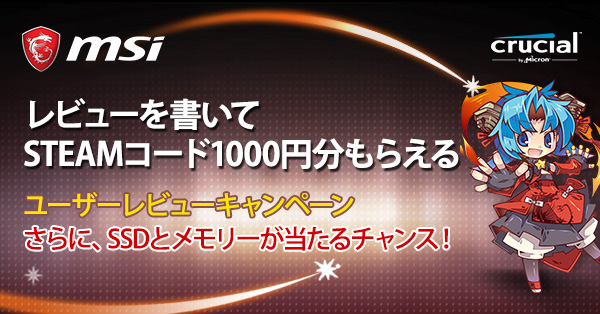 2017年3月8日-Micro-Star International Co., Ltd. 台湾・新北市- マザーボードの設計で世界をリードするMicro-Star International(MSI)は、3月8日~4月12日の期間中、価格.comやAmazon.co.jp、Zigsowなど、ユーザーレビューが投稿できるサイトに、MSIマザーボードを使用した感想をご投稿いただいたユーザーに、もれなくSteamのウォレットコード1,000円分をプレゼントするキャンペーンを実施いたします。