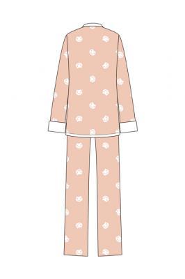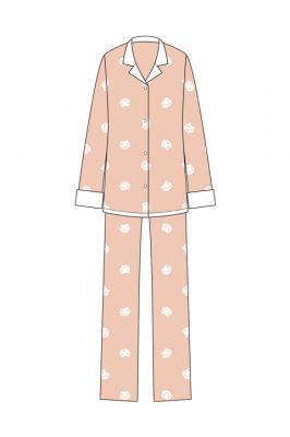 すこしオレンジがかった特徴的なピンク色と、にやっと笑ったネコのモチーフがかわいい1着。