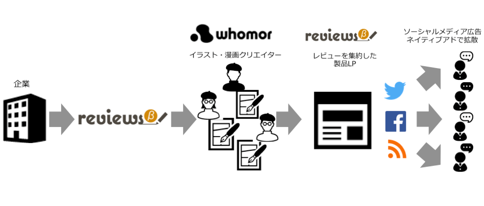 フーモアがネットワークしているイラスト・漫画クリエイターのレビューコンテンツ集約した特集ページ(LP)を作成し、ツイッター、フェイスブックなどのソーシャルメディア広告や、ネイティブアドを活用して、拡散していきます。理解が進みやすい、イラスト・漫画によるレビューコンテンツをより多くの方に届けることが可能になります