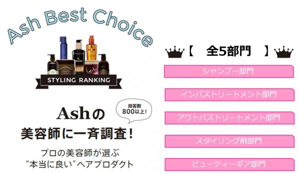 美容室チェーンを展開する 株式会社 アッシュ(神奈川県横浜市中区/代表取締役社長 吉原 直樹)( http://www.ash-hair.com/)は、美容室で働くスタッフに対してヘアに関連する商品についてのアンケートを実施しました。アンケートの内容は、全5部門(シャンプー、インバストリートメント、アウトバストリートメント、スタイリング剤、ビューティーギア)があり各部門ごとに好きな商品をひとつだけ選ぶというもので、プロの美容師が選ぶ“ベストコスメ”とも言える内容になっています。また、選んだ商品に対する実際の使用感についてもそれぞれ回答しています。このアンケートは2017年2月10日~2017年2月17日の期間に実施され、株式会社アッシュのサロン全116店舗(2月末時点)でスタイリスト、アシスタント、レセプション(816人)が回答しました。