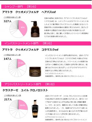 インバストリートメント部門は票が分かれ、1位の『アマトラ クゥオメゾフォルテ コラマスクmf』を選んだのは全体の17.9%となりました。トリートメントの役割であるダメージ補修力に対して実感する声が多く得られ、指通りはどちらかと言えば“しっとり”よりも“さらさら”と実感する人が約1.5倍となりました。