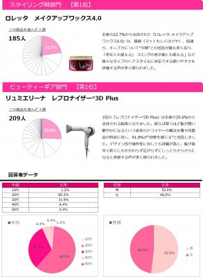 ビューティーギア部門においては、比較的高機能で高単価のものが人気を集める傾向にあり、ドライヤーやヘアアイロン以外にもボディケア器具など“美”に関する様々なカテゴリの器具が評価され、効果に対する実感はもちろん操作性やデザイン性も高い評価を得る結果となりました。
