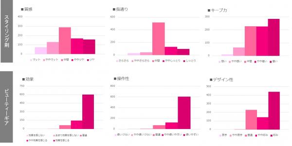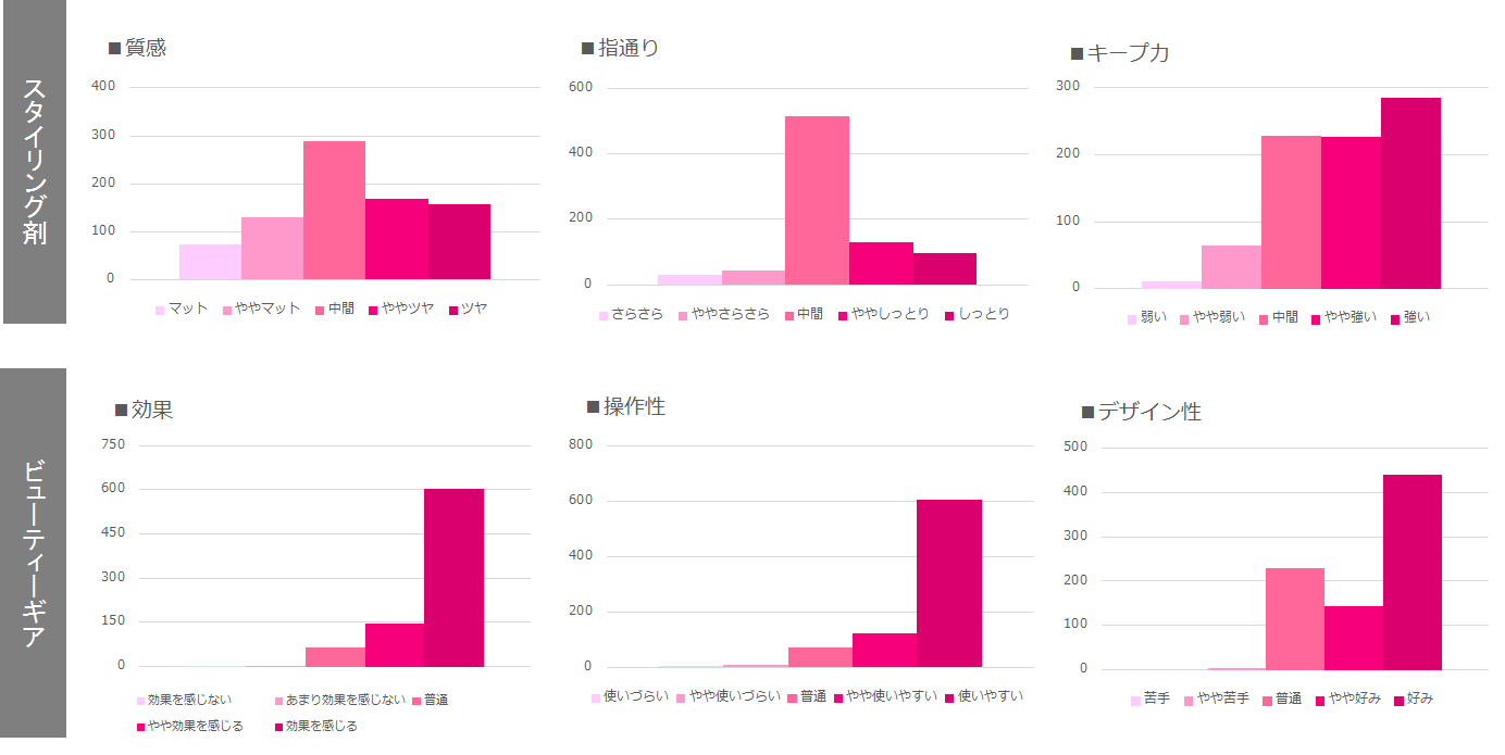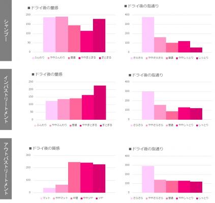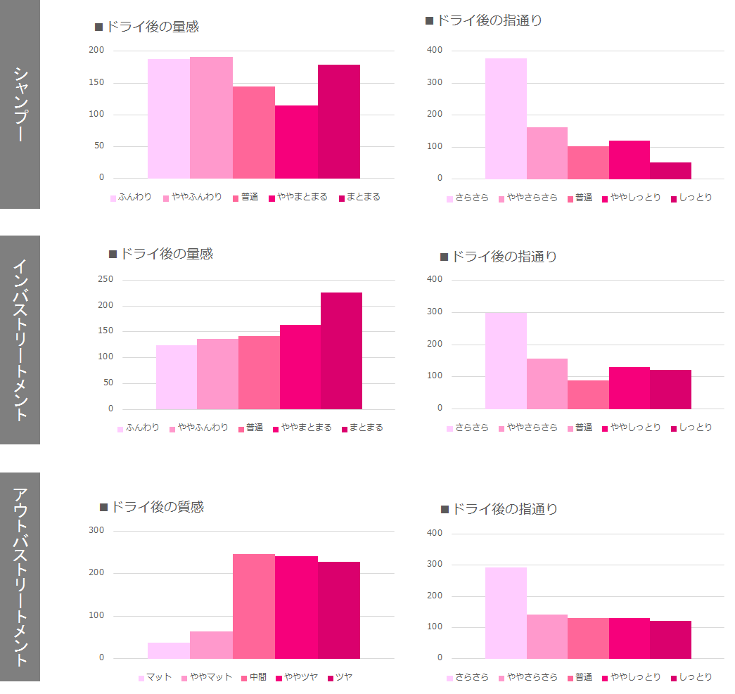 インバストリートメントについては、量感は「まとまる」「ややまとまる」が「ふんわり」「ややふんわり」より1.5倍多い結果となりましたが、指通りは同様に「さらさら」が1.8倍多く支持される結果となりました。
