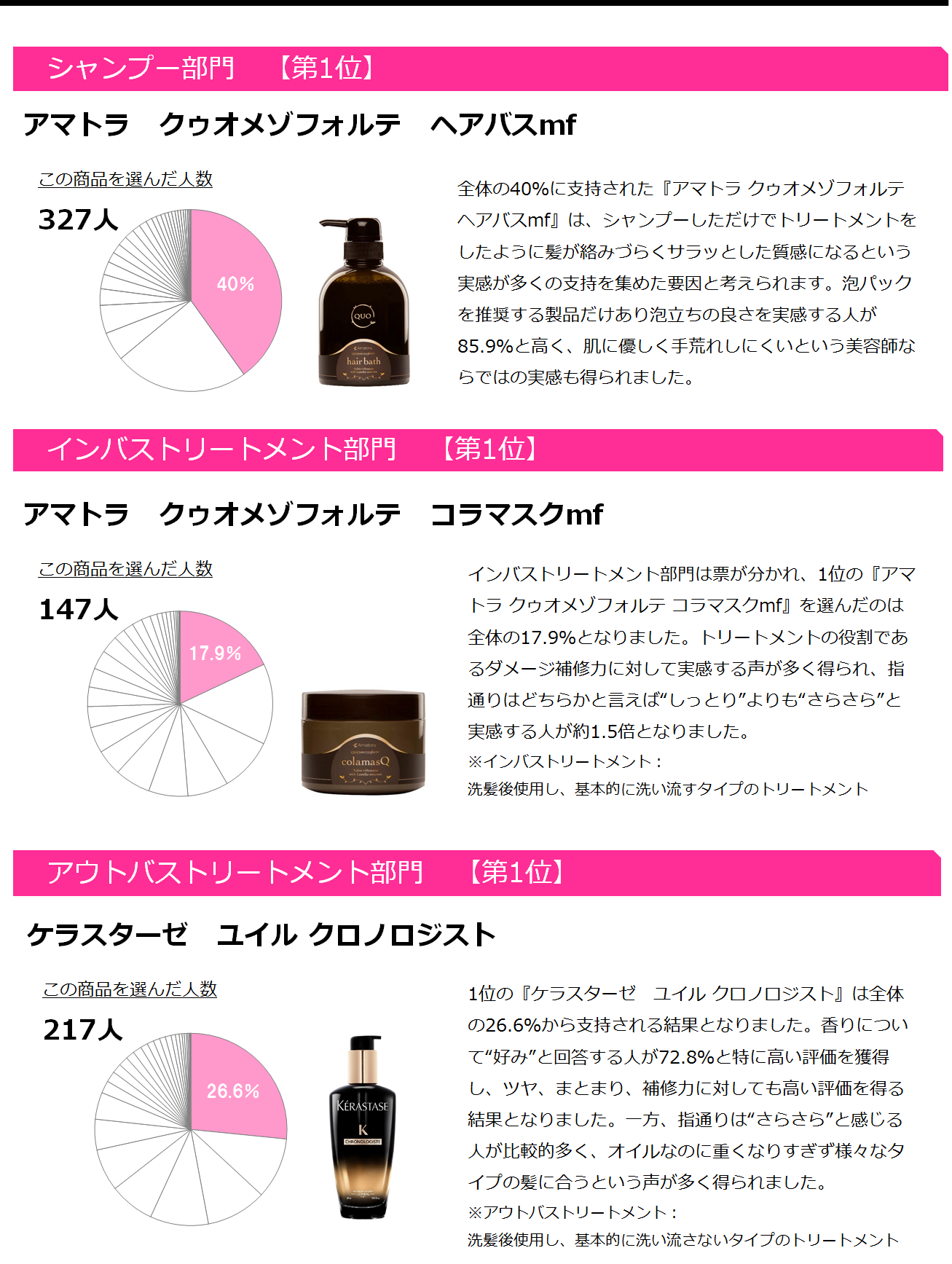 全体の40%に支持された『アマトラ クゥオメゾフォルテ ヘアバスmf』は、シャンプーしただけでトリートメントをしたように髪が絡みづらくサラッとした質感になるという実感が多くの支持を集めた要因と考えられます。泡パックを推奨する製品だけあり泡立ちの良さを実感する人が85.9%と高く、肌に優しく手荒れしにくいという美容師ならではの実感も得られました。