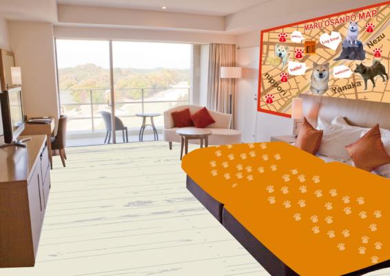 「柴犬まる:キャラクタールーム」では、宿泊者に「柴犬まると一緒に宿泊しているような体験」をキャラクターに様々な施設内グッズやアメニティのご提供をいたします。