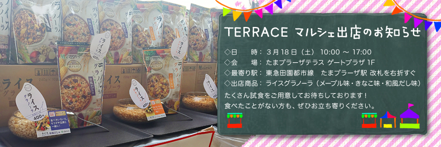 される「TERRACE マルシェ」に初出店し、国内産 100%のお米で作った「ライスグラノーラ」の試食販売