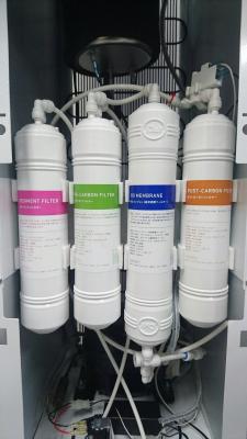 「クール・クー」では4種類のフィルターを通って水道水がろ過されます。まず「セディメントフィルター」で水道水に含まれるサビや砂、チリ等の不純物を取り除き、初期段階での不純物除去効果を最大限高め、他のフィルター寿命を延ばすことができます。続いて「プリカーボンフィルター」という吸着工程を通して、塩素、トリハロメタン、有機化合物といった微細な不純物を取り除きます。そして、「ROメンブレン(逆浸透膜フィルター)」を通し、高圧と0.0001~0.001umのさまざまなサイズの半透膜を利用して、バクテリアや重金属等の人体に有害な物質を分子レベルで除去してピュアウォーターに生成します。そして最後は「ポストカーボンフィルター」を通り、水中に溶解されたガス成分や塩素、悪臭を除去し、水の味をまろやかにします。