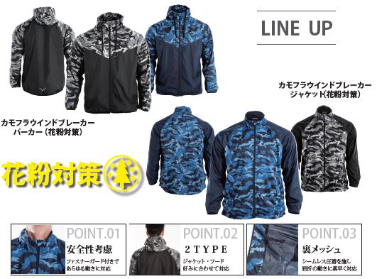 カモフラージュと無地を袖の切り替えたバイカラータイプのジャケット、胸の切り替えでデザインしたパーカーの2タイプ。カラーは定番のブラックベースと深みのあるブルーの2 配色の展開です。生地の表面に花粉が落ちやすい加工を施しており、高めの衿やフード、袖口のゴム、裾に通したドローコードでさらに外気をブロックします。裏地は肌触りを考慮したメッシュ素材を使用し、ロングシーズンの利用が可能です。バックヘムにはリフレクタープリントを採用し夜間着用の際の安全性を考慮。同シリーズのボトムも種類を増やし上下セットでの着用が出来コーディネートの幅が広がります。