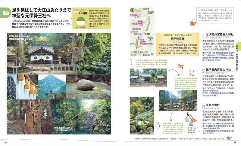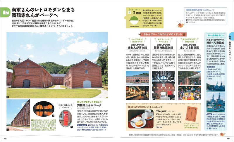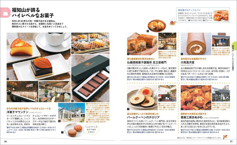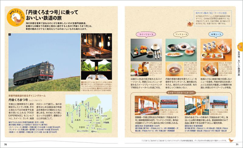 ここでは与謝野、福知山、綾部を収録しています。伝統文化や工芸、山の恵みを背景に、城下町のスイーツ店やのんびり過ごせるカフェ、黒谷和紙体験等を掲載。「海の京都」を訪れるならぜひ乗車したい京都丹後鉄道の旅もご提案しています。