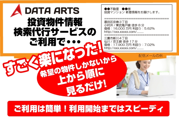 不動産ビッグデータ分析に強いシステム・サービス提供会社である合同会社データアーツ(代表 鈴木 将親)は、平成29年3月15日より不動産会社の業務軽減・代行を行うサービス「投資物件情報 検索代行サービス」を開始いたします。