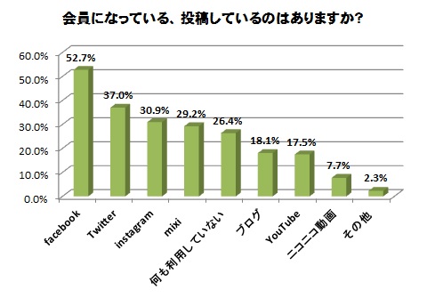Facebookのアカウント所有者が半数を超えている一方で、若者中心に利用が広がっているinstagramはそれほど利用が広がっていません。