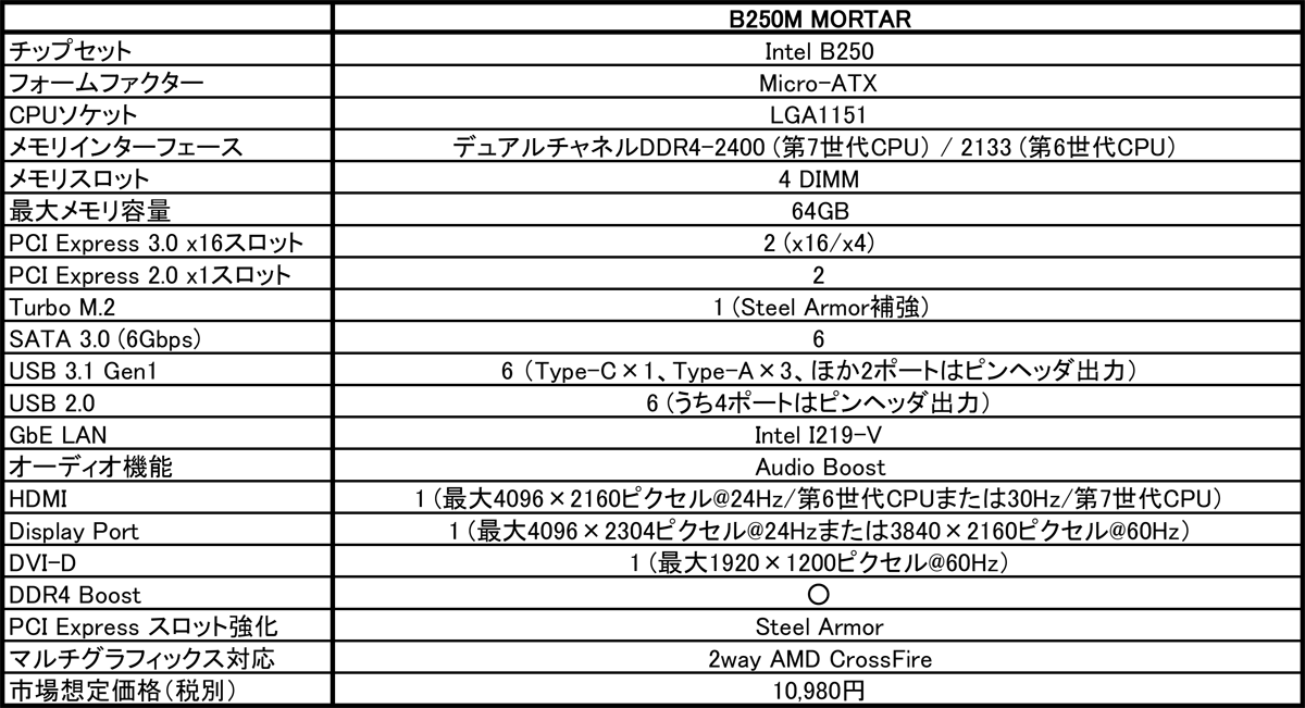 2017年3月16日-Micro-Star International Co., Ltd. 台湾・新北市- マザーボードの設計で世界をリードするMicro-Star International(MSI)は、第7世代Intel CoreプロセッサーをサポートするIntel B250チップセット搭載ゲーミングマザーボードの新製品として、PCゲーム入門環境構築に最適なMicro-ATXマザーボードの「B250M MORTAR」を追加し、3月18日より販売を開始いたします。市場想定価格は、10,980円です。