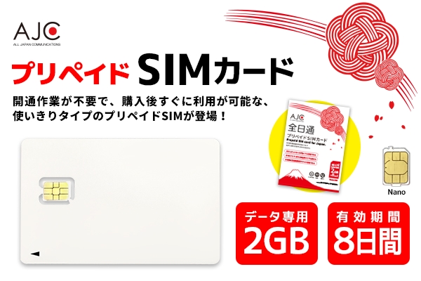 「AJC (All Japan Communications) 全日通プリペイドSIMカード」2GB/1DAY 8日間プランは、利用開始手続き(アクティベート)を完了した日から8日間、2GBのデータ通信を行うことができます。