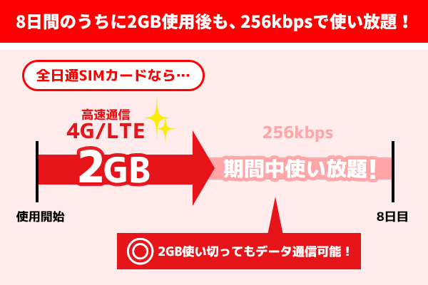 8日のうちに2GB使い切ってしまっても、256kbpsの速度で使い続けることができます。