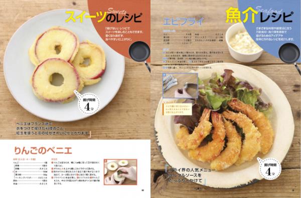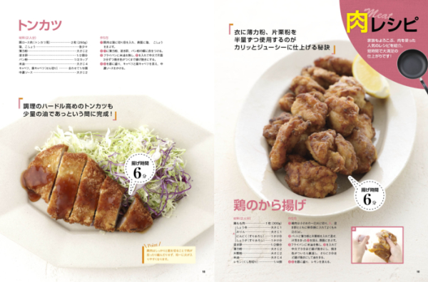 通常の揚げものの場合、直径20cm、深さ3cmの鍋を油で満たそうとすると600~700mlを必要としますが、本書で使用する油の量はどれも大さじ4(60ml)程度。少ない油で数分「揚げ焼く」ことで通常の揚げものと変わらないヘルシーなおいしさを作れることができるんです。今回、この調理法で断然おいしくなる「揚げもの」を70種類、主食・副食・デザートなどに分けて紹介しています。