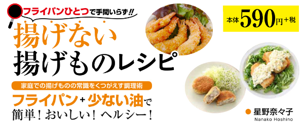 ご家庭で、揚げもの……作っていますか? 最近は揚げものをする家庭が少なくなってきているそうです。実は、家庭での揚げものを敬遠する要素のひとつとして「調理器具の多さ」が挙げられるんです。本書では、揚げものを避けてしまうわずらわしさを払拭すべく、すべてのレシピをフライパンで行えるように構成。そして、調理器具のスリム化を積極的に考え抜きました。家庭にあるような普通のフライパンで揚げられるので、油の始末や後片づけも簡単。手軽に“揚げない”揚げものを楽しめること、間違いありません。