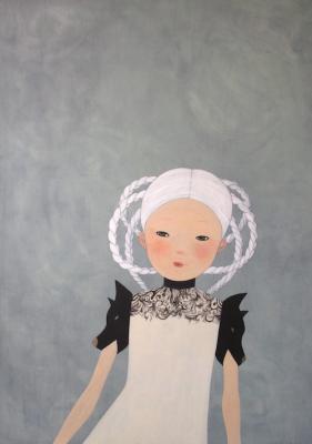 本展は、越後氏にとって1年ぶりとなる東京での個展です。「幼い女の子もおばあちゃんも、野心を秘めて何かに黙念と打ち込む女性は、美しく逞しい」という彼女の創作の変わらぬ主題のひとつを本展タイトルに引いています。大小の新作アクリル画、約30点をメインとして、好評を集めている小さな置き作品シリーズも展示・販売いたします。また、服飾制作を手がける菅田明穗氏との協働により、今回初めて作られる、絵から生まれた洋服作品も紹介する他、オリジナルトートバッグやTシャツ、チャームなどの雑貨類も合わせて販売いたします。