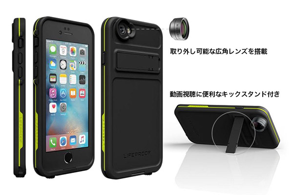 iPhone 6/6sユーザーに朗報!防水・防塵・防雪・耐衝撃ケースの決定版「LIFEPROOF」に、取り外し可能な広角レンズを搭載したニューモデル「fre SHOT for iPhone 6/6s」が登場しました。バックプレートには動画の視聴に便利なビルトイン(内蔵式)のキックスタンドを搭載しているのも特徴です。