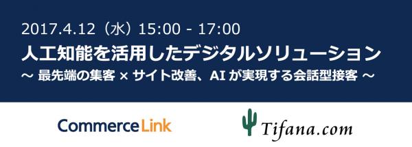 ECサイトの集客・売上拡大を支援するコマースリンク株式会社(本社:東京都大田区、代表取締役社長:永山 淑子)は、株式会社ティファナ・ドットコム(本社:東京都目黒区、代表取締役社長:藤井 亮)と共催し『人工知能を活用したデジタルソリューション~最先端の集客×サイト改善、AIが実現する会話型接客~』と題した無料セミナーを2017年4月12日(水)に開催します。
