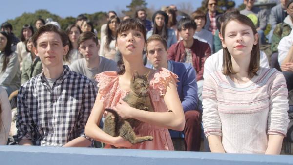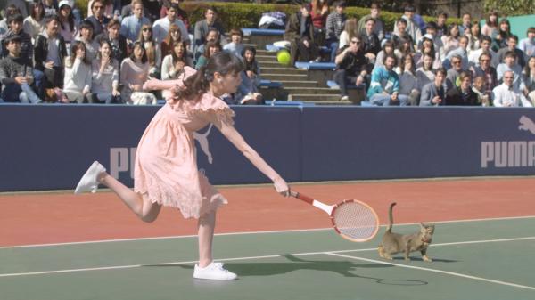 70年代後半を彷彿とさせるテニスコートに試合を観戦する猫を抱えた新川さんの姿。コートに飛び出してしまった猫を守るためラケットを手に飛び出すと、差し出したラケットに見事にボールがはじかれ相手選手のコートにイン。試合を見ていた観客は、オールスタンディングで彼女のプレーに拍手喝采した。勝ち誇ったように、猫を抱えコートに立つ新川さんは文字通り“無敵にカワイイ。”「コートスター」
