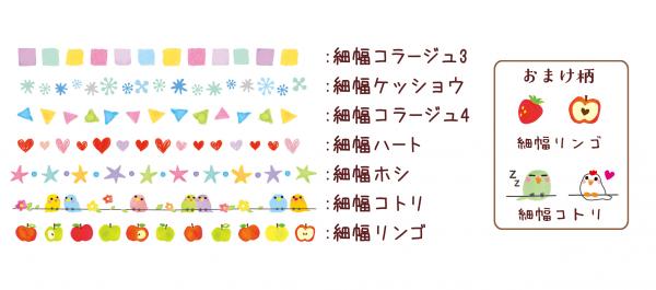 「プチデコラッシュ」シリーズの中でも人気が高い「細幅ライン」がさらにバリエーション豊かに。カラフルな四角形や星をモチーフにした「細幅コラージュ3」「細幅ホシ」などのシンプルなパターン柄から、小鳥が枝に止まっている「細幅コトリ」など可愛い柄まで、全7柄をラインアップ。その日の気分に合わせて手帳を楽しくデコレーションすることができます。「細幅コトリ」「細幅リンゴ」には、こっそり「おまけ柄」が入っているのでお楽しみに♪
