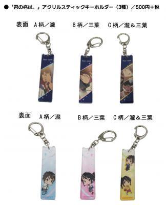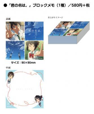 瀧・三葉の場面写とSDイラストが表裏にプリントされた【アクリルスティックキーホルダー】(3種)/500円+税、表紙に作中の美しい場面写を使用したデザインの【ブロックメモ】(1種)/580円+税、の2点を発売します!
