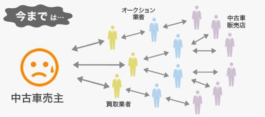 多くの方が行っている現在の一括査定では、様々な買取業者からの電話が鳴りやまない、また、業者ごとの査定が必要であるなど、時間のないお客様にとって大変負担が大きいものとなっています。また、現在の中古車マーケットでは、中間業者が非常に多く、何段階もの流通マージンが発生しており、高額での売却が困難となっています。なるべく高く売りたい売主と、なるべく安く買いたい買取業者の間では常に利益相反が起こるため、価格交渉による大きなストレスがかかります。また、各買取業者により提示される買取価格が様々であり、お客様自身での判断が困難であるなど、中古車業界が抱える問題は多岐にわたっています。