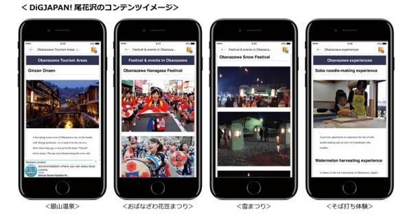 今回、「DiGJAPAN!」アプリ上で追加リリースされるコンテンツ「尾花沢エリア」では、季節ごとのモデルコースの紹介、そして訪日観光客の関心が高まっている大正ロマン漂う銀山温泉、のほか、「おばなざわ花笠まつり」「雪まつり」といったイベントや、名物のそば打ち体験など、市内各所にある尾花沢の観光資源を余すところなくご紹介。
