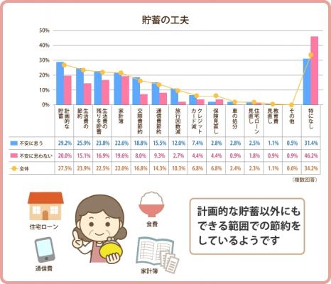 老後の資金準備のために、今の日常生活の中での工夫や取り組みをしているかとの問いの最多回答は「特に取り組んでいない」となっている。