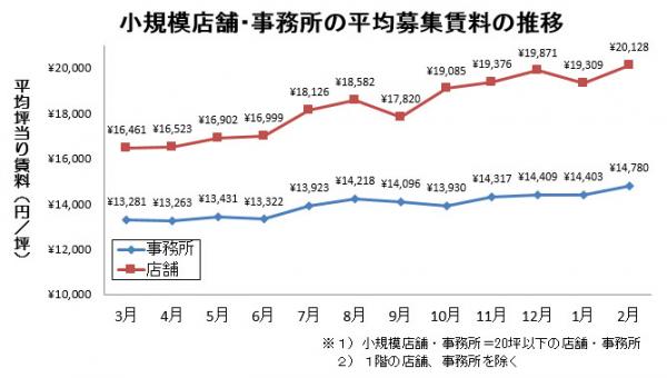 2月は、事務所と同様に、賃料低めの物件が成約し、募集中物件の平均賃料が上昇した形となっています。