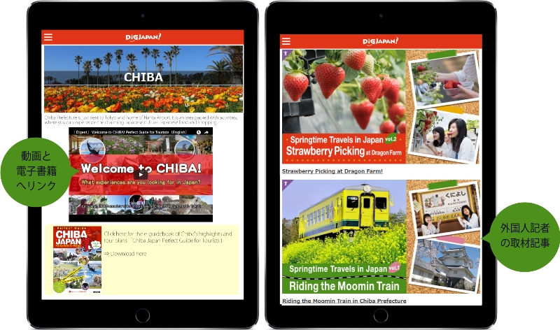 訪日外国人向け観光情報サイト「DiGJAPAN!」に千葉県特集ページを開設し、DiGJAPAN!公式SNSを活用してPRします。千葉県特集ページからはプロモーションビデオが閲覧でき、電子書籍版ガイドブックを閲覧するためのリンクも設置します。また、外国人観光客に人気の千葉の体験、ショッピング、グルメなどの魅力を、DiGJAPAN!編集部の外国人記者が取材し制作したタイアップ記事を掲載します。