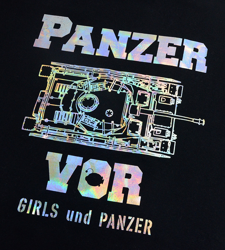 インパクトあるホログラムプリントを、戦車の線画をメインに据えてデザイン。