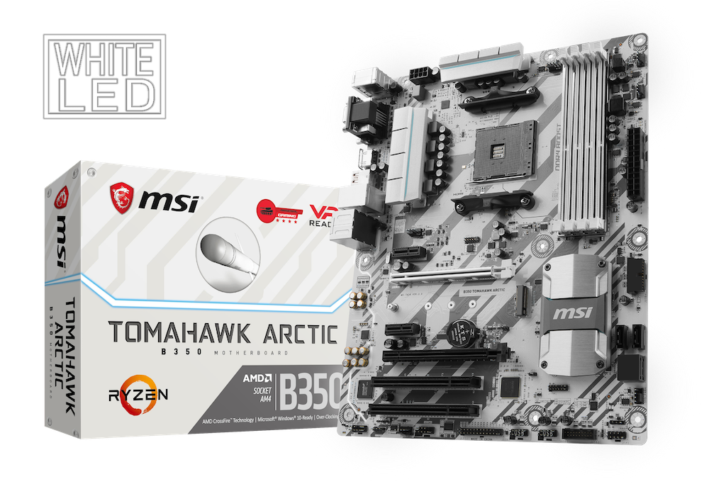 2017年4月5日-Micro-Star International Co., Ltd. 台湾・新北市- マザーボードの設計で世界をリードするMicro-Star International(MSI)は、AMD Ryzen 7シリーズに対応したSocket AM4マザーボードとして人気の「B350 TOMAHAWK」の白基板モデルとなる「B350 TOMAHAWK ARCTIC」を追加し、4月8日よりTSUKUMO各店限定で販売を開始いたします。本製品は、カジュアルゲーマーやPCゲーム初心者に最適なGAMINGマザーボード、Arsenalシリーズに属する製品で、チップセットにAMD B350を採用したATXマザーボードです。市場想定価格(税別)は、14,980円です。