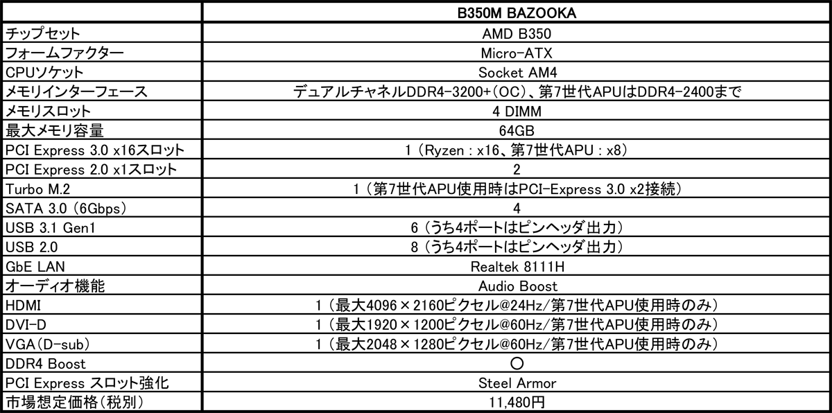 2017年4月5日-Micro-Star International Co., Ltd. 台湾・新北市- マザーボードの設計で世界をリードするMicro-Star International(MSI)は、AMD Ryzen 7シリーズに対応したSocket AM4マザーボードのラインナップに、Micro-ATXマザーボードの廉価版モデル「B350M BAZOOKA」を追加し、4月8日より発売いたします。本製品は、チップセットにAMD B350を採用し、カジュアルゲーマーやPCゲーム初心者向けに機能を絞り込むことで低価格化を図っています。市場想定価格(税別)は、11,480円です。