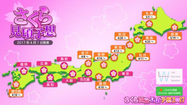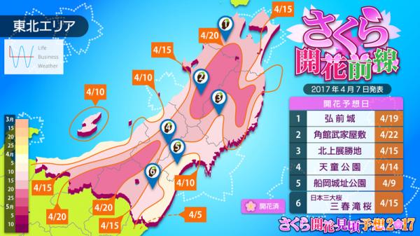 来週はじめにかけては、関東から九州の平地では、さくらの見頃を迎えるでしょう。ただ、開花・満開の早かった東京都心では、週末は花散らしの雨となり、さくらは見納めとなりそうです。今週、北陸地方に到達したさくら開花前線は、いよいよ東北地方に入るでしょう。さくらの見頃は、東北南部で4月中旬、東北北部は4月下旬に、平年より早いペースで迎えそうです。4月中には、北海道でもさくらが咲き始め、札幌ではゴールデンウィーク前半の4月30日に咲き始める予想です。