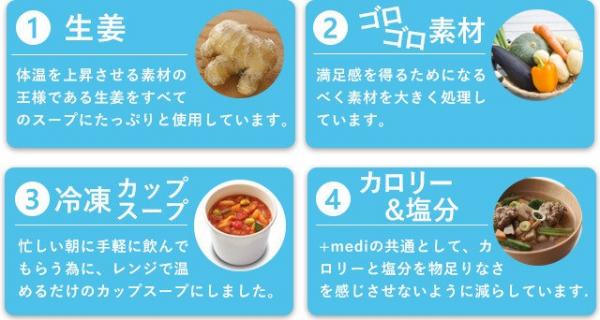 今回のモニター試験で利用したスープは、+mediが5月17日に発売を予定している、ON!活スープです。生姜・根菜など体温上昇に効果があるといわれる食材を中心にゴロゴロ素材でカロリー・塩分に配慮して企画しています。