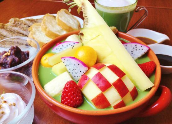 苺や林檎、バナナやパイナップルなどたくさんのフルーツを爽やかな香りの《抹茶豆乳みるく》で温めます。程よく柔らかくなった温かいフルーツは付属の蕎麦粉のクレープに巻いたり、バケットに乗せて食べたり!又は温かいフルーツに冷たい抹茶アイスをのせて食べたりと食べ方は自由です!もちろんそのまま食べてもとっても甘くてジューシー!