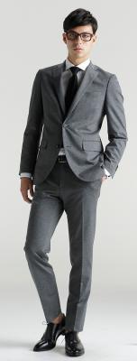 ウールのような風合いのポリエステル素材に、伸縮性に優れ自宅で洗濯できるウォッシャブル機能を備えたスーツ。