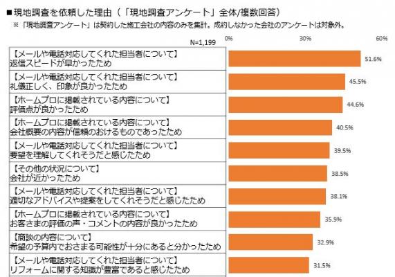 現地調査を依頼した理由で最も多かったのは「【メールや電話対応してくれた担当者について】返信スピードが早かったため(51.6%)」。