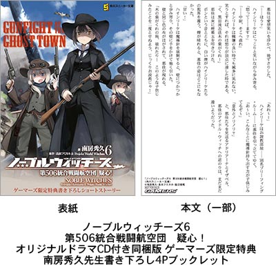 さらに、『ノーブルウィッチーズ6 第506統合戦闘航空団 疑心!』オリジナルドラマCD付き同梱版を、全国のゲーマーズでご購入頂いた方には、限定特典として【南房秀久先生書き下ろし4Pブックレット】を、通常版をご購入いただいた方には、【オリジナルブロマイド】を差し上げます。