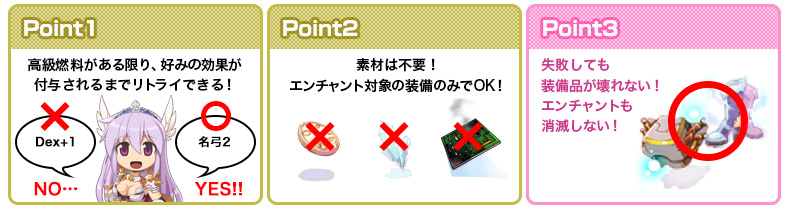 しかもエンチャントの素材が不要で失敗時のペナルティが発生しないというスグレモノ。