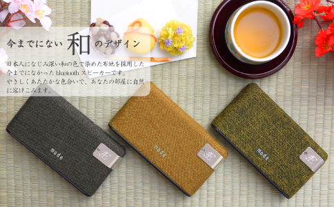 日本人がゆっくりと寛げるような、趣のある空間で音楽を楽しむためにデザインした、和テイストのBluetoothスピーカー。畳や和室、座椅子などの古くから日本にある家具を配置したロースタイル空間に合う深い和の色で染めた布地を使用しています。