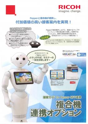 ロボットによる接客案内ソリューション「接客ガイド」シリーズをはじめとしたロボティクス事業を手がける株式会社ユニキャスト(茨城県日立市)は、リコー製複合機と「接客ガイド for Pepper」(以下、「弊社サービス」という。)の連携ソリューションである「接客ガイド for Pepper 複合機連携オプション」(以下、「本機能」という。)を開発しました。本機能はリコージャパン株式会社から販売され、Pepper×複合機の連携で新たな価値を提供してまいります。