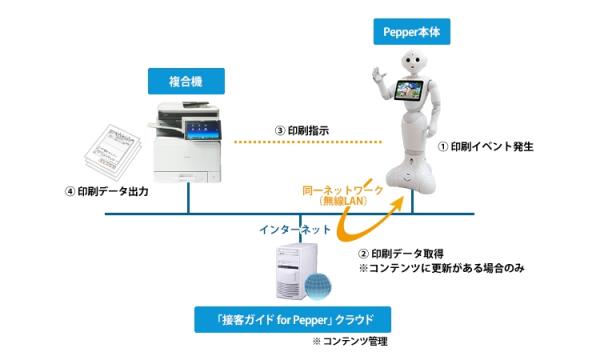 本機能は、リコー製複合機との連携ソフトウェアの開発・提供を支援する「Ricoh Developer Program」を活用し、ユニキャストが株式会社リコーの技術協力のもとで開発・提供するもので、対応する複合機と接客案内中のPepperが連携し、多彩なプリンティングを実現します。