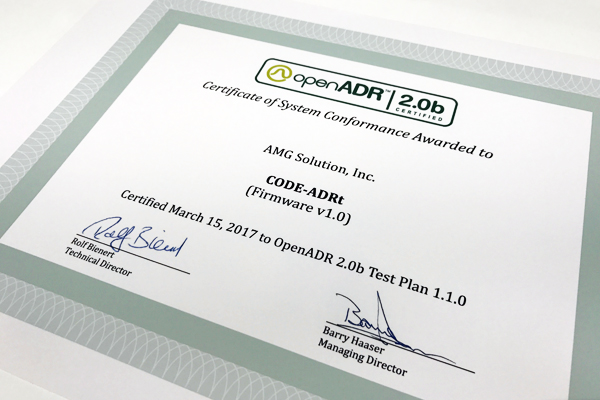 システム開発を業務とする株式会社AMG Solutionは、2017年3月15日にOpenADR2.0b(VTN)を、2017年4月18日にOpenADR2.0b(VEN)(※取得済みであったpull/simpleHTTPを含む)の認証を取得したことを発表いたします。