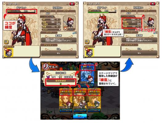 「練度」はバトルによって強化できるステータスです。バトルステージをクリアすることで獲得できる「修練値」を一定数貯めることで「練度」を上げることができます。「練度」が上がるとキャラクターのHP・攻撃力・防御力などのステータスが上昇します。