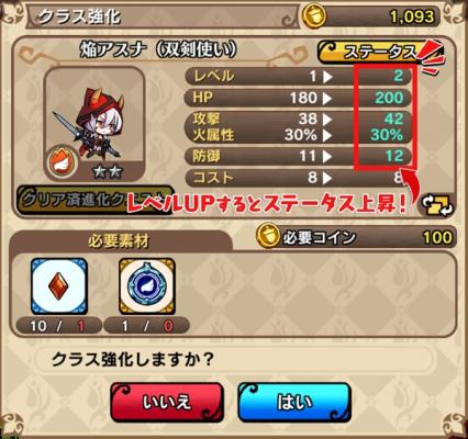 「練度」と同じように「クラスレベル」を上がることでキャラクターの各ステータスが上昇します。