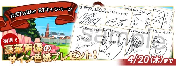 『エアリアルレジェンズ』公式Twitterアカウントをリツイートで、『エアリアルレジェンズ』に出演している豪華声優陣のサイン色紙を各5名様、計40名様に抽選でプレゼント!!