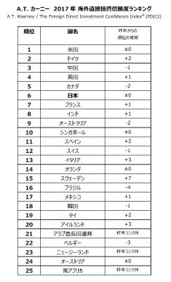 経営コンサルティング会社A.T. カーニー(本部:米国イリノイ州シカゴ、東京オフィス:港区)は、本日、「海外直接投資信頼度指数(The Foreign Direct Investment Confidence Index(R): FDICI)」の調査結果を発表。投資先として魅力のある国上位25カ国をランキングした。